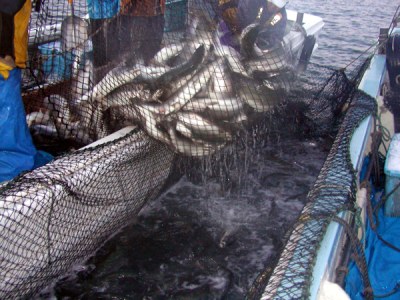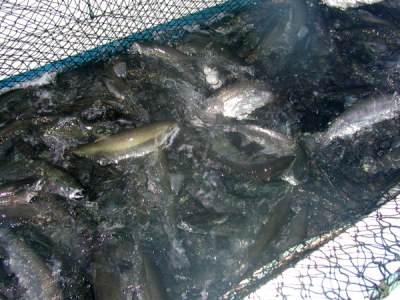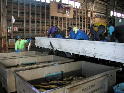 荷揚げ1:この日は4,000尾以上の大漁でした。