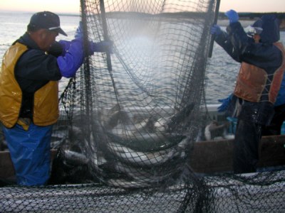 カラフトマスは、オホーツク海沿岸を中心に夏から秋にかけて、定置網で漁獲されています。夏(7~8月)は小型定置網による漁獲で、浅瀬を回遊するカラフトマスを漁獲するには効率の良い漁法です。