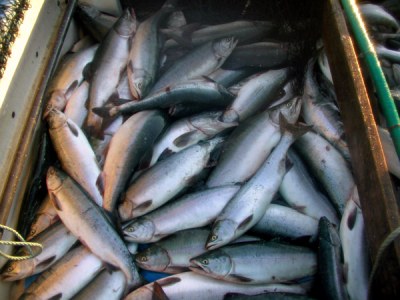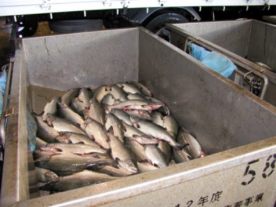 出荷:選別が終わり、出荷を待つカラフトマス。