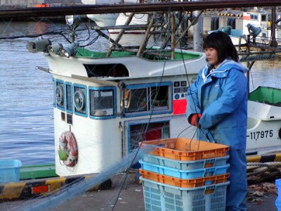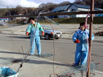 網さやめ1:網に付いたゴミを取ったり、破れたところを補修し、次の漁に向けて準備をしている様子。