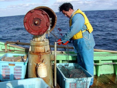 揚網1:網はネットホーラー(揚網機)を使って揚げます。大漁の願いを込めて、網を握る手には自然と力が入ります。