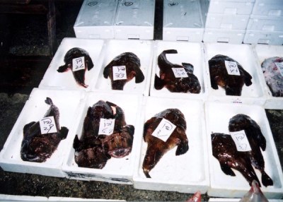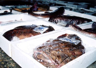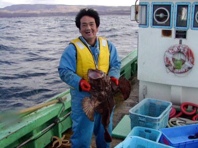 この時期、アンコウは沖から陸に移動してくるため、漁期始めは70~100メートルの水深帯、12月中旬には40~70メートルの浅い水深帯で漁獲されますが、それ以降は再び沖に移動するようです。 通常、投網から2~3日後に揚網し、すぐ予備の網を投網してから帰港しますが、この期間は時化が多く10日~2週間揚網できないこともあるため、年により出漁日数は大きく異なり、漁獲量は大きく変動します。また、毎年12月中旬には天敵であるトドが来遊し食害や漁具被害が多くなるため、それまでにどれくらい獲れるかが好不漁のカギとなります。
