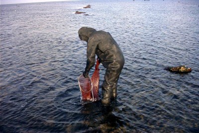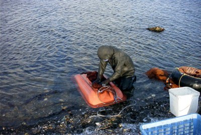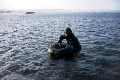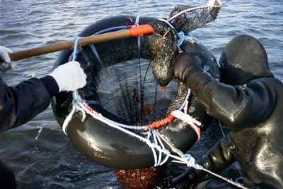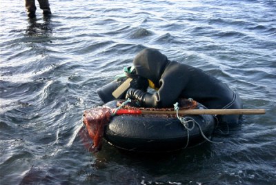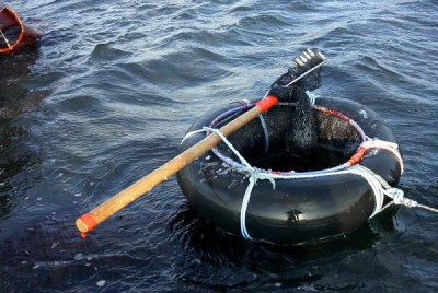採取4:浮き(タイヤチューブ)についた袋網に収容し、貯めていきます。