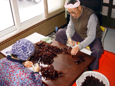 製品化1:雑物を取り除き、根元部分をハサミで切り取ります。