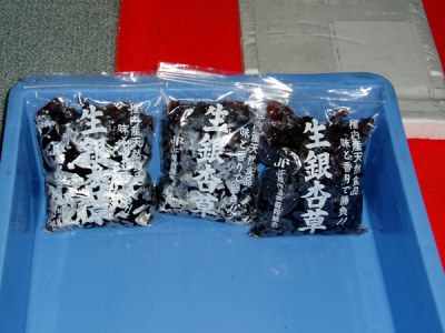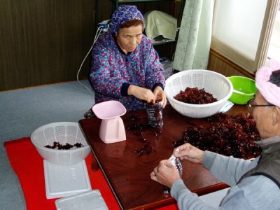 採取したギンナンソウは、陸上にて雑物を除去し、根元部分を一つ一つハサミで切り取ります。その後、計量し袋詰め(100グラム)して出荷します。