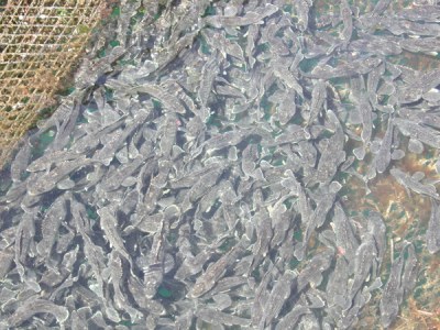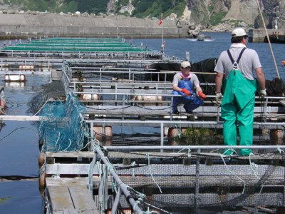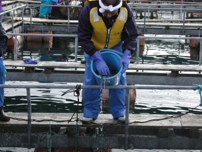 6月に栽培公社瀬棚事業場から平均全長40ミリメートルの稚魚を5万尾輸送して海中生簀に収容します。収容数は中割り生簀1基に20,000尾、小割り生簀3面に10,000尾ずつです。その後、魚の成長に伴って収容密度を減らして分散を繰り返していきます。