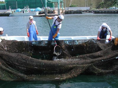 収容後2年半飼育して、重量が450グラム以上になった魚から順次活魚で出荷し3年後までに全数を出荷する体制で行っています。