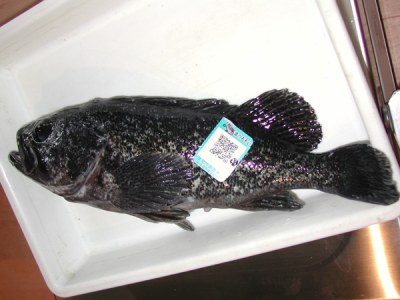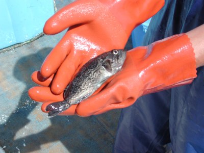 出荷魚:この日に出荷された魚は500グラム以上の大型でした。試験的にタグを付けています。