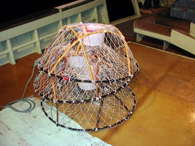 餌入れ:スルメイカ・キュウリウオ等を餌とします。手際よく詰めないとかごの再投入に間に合いません。