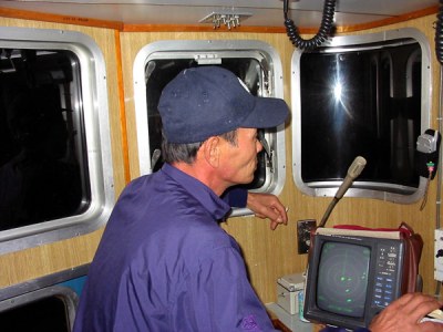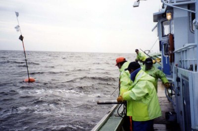 かご揚げ1:設置したボンデン(浮標)をつかまえる。