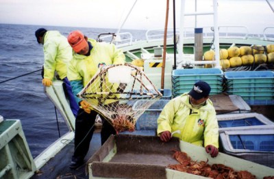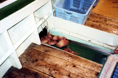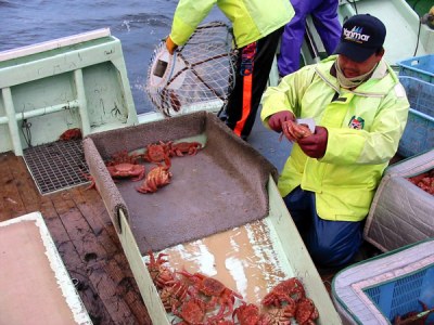 放流:漁獲対象外のケガニ(雌ガニ、甲長8センチメートル未満のカニ、軟甲ガニ)は放流します。
