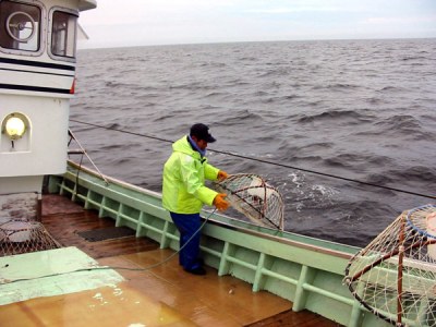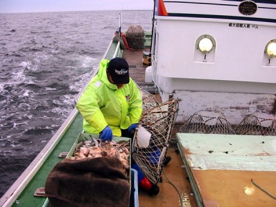 一本ののしには10メートル間隔で250個のかごが付いており、長さは約3キロメートル、一度かごを設置した漁場は漁獲が少なくなるまで移動せず、船長を含め6名の乗組員で手際よくかご揚げ、餌替え、かごの再投入を行っています。ケガニは、スルメイカを餌にすると入籠率が良いのですが、高価であるためキュウリウオも併用しています。漁獲されたケガニは船上で甲長8~9センチメートル(小)、9センチメートル以上(大中)の雄の甲羅の堅い堅ガニだけを選別し、それ以外は全て放流します。