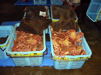 3月15日以降のオホーツク海の流氷がなくなる海明けを待って漁業が始まります。夜中の1時頃出港し、水深60~130メートルの漁場6ヵ所に設置したけがにかご合計1,500個を揚げ、再び設置して朝7時頃帰港します。