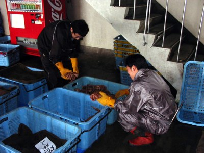 市場での検品:市場では再度若ガニや小型ガニが入っていないか検品します。