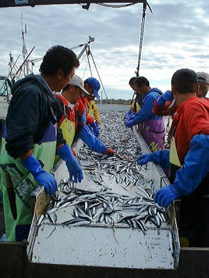 荷揚げ:フィッシュポンプを使ってカタクチイワシを水揚げしています。