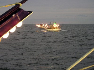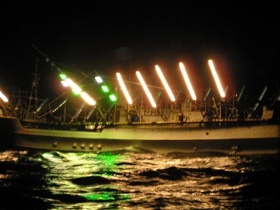 操業2:集魚灯は右舷側を点灯した後、左舷側を点灯します。サンマが集まったのを確認し、右舷側の集魚灯を消灯し、左舷側に集めます。その後、左舷側も消灯し誘導灯で海面を照らし、サンマを網の中に誘導していきます。