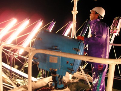 網・集魚灯:棒受け網を漁船に積み込みます。漁船には集魚灯も設備されています。
