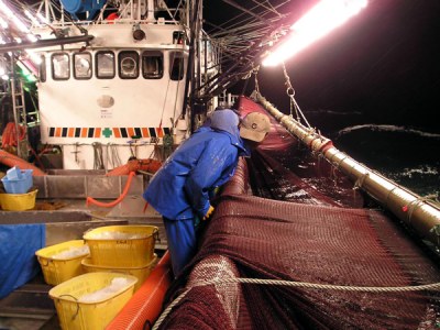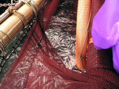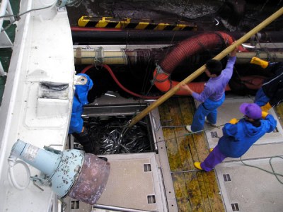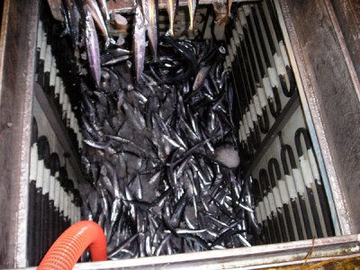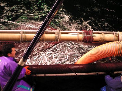 荷揚げ1:帰港後、船倉からタモ網でサンマを汲み上げます。