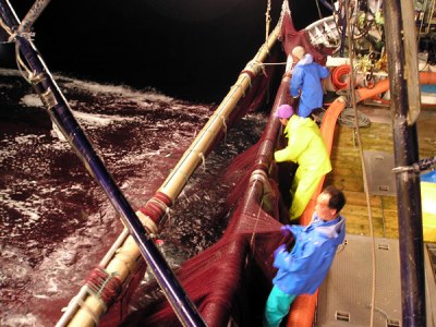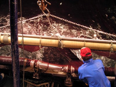 操業3:魚群が網に入ったのを確認し、網しぼりを開始します。