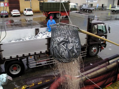 荷揚げ2:汲み上げたサンマはトラックへ積み込まれます。