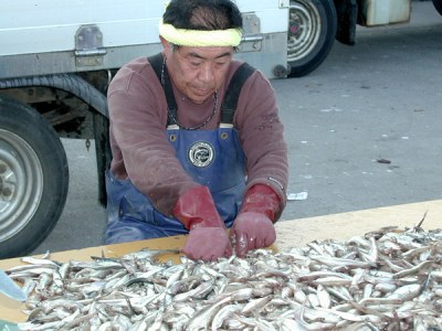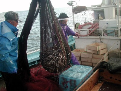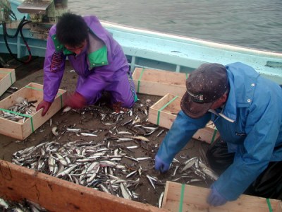 漁獲物1:シシャモは大小に選別します。
