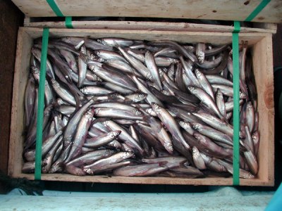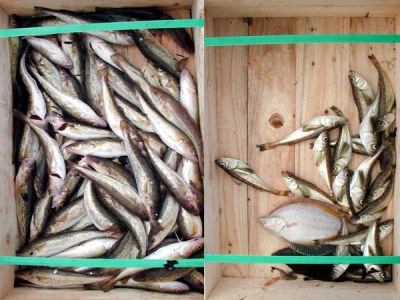 漁獲物2:この日はコマイ、ハタハタ、カレイ類が主に混獲されました。左がコマイ、右がハタハタ、カレイ類。