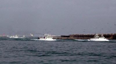 帰港:操業は6時から14時までに決められているので全船一斉に鳥山を従えて入港します。