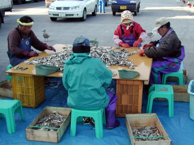 選別2:選別は短時間で終わらせなければなりません。家族総出でシシャモにむかいますが、最盛期にはパートさんを雇うこともあります。