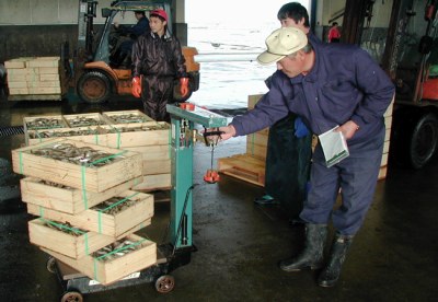 出荷:木箱に入れたシシャモは漁協の市場に運んで計量を受けます。