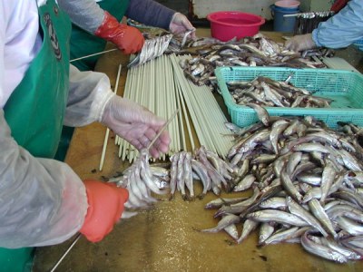 加工1:加工場で女工さんがシシャモを串に通しているところです。