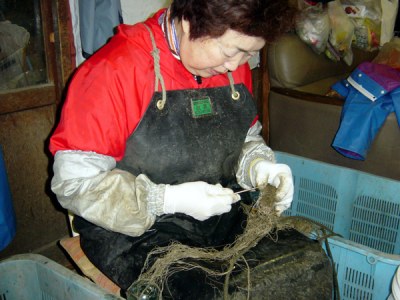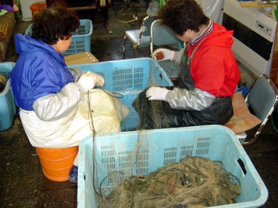 シャコは死ぬと鮮度が落ちやすく、生きている間に茹でてしまわないと殻がむけにくくなることから、網外しは人手と素早さ・丁寧さ等の手先の技術を必要とします。