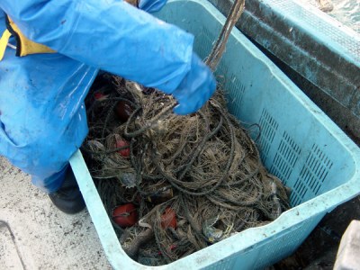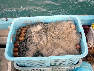 刺し網:籠に収められたしゃこ刺し網。
