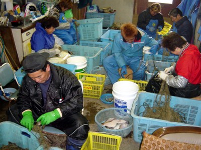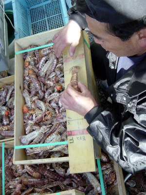また、漁業者が各自番屋で茹で上げて、オス・メスそれぞれS、M、Lのサイズ別に選別してから市場に出荷する(更に殻をむいてから出荷するむきシャコもある)、非常に手間のかかる漁業でもあります。