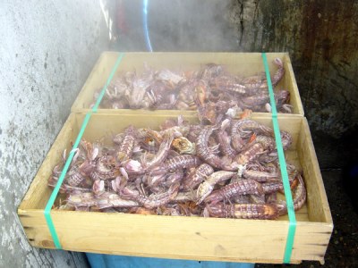 | 出荷形態 | 茹で上げ殻付きシャコ(発泡スチロール深箱下氷5キログラム詰め)の他に、茹で上げ後に殻を剥いて冷凍した剥きシャコの出荷もある。 |
