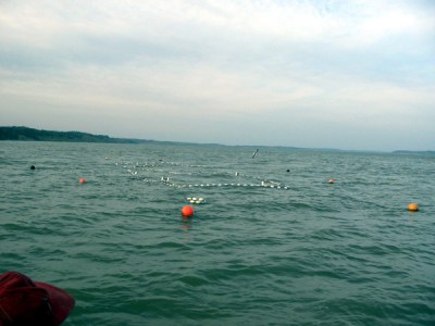 小型定置網の全景:手網は沖陸方向に約120メートルあります。