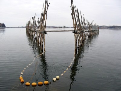 張待網の全景:櫓(やぐら)は一つが75メートル程の長さでハの字型の開口部側は約50メートルで狭い奥の部分は2~3メートル程となっています。
