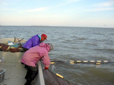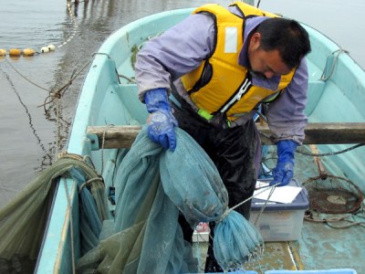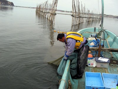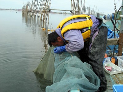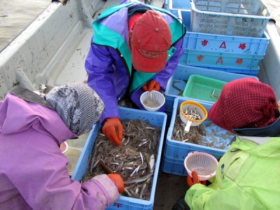 漁獲された魚はピンセットを使用して選別(シラウオ・チカ)します。漁は潮に左右されることは殆どなく、毎日、シラウオが漁獲されます。また、網の中でシラウオが死ぬことも殆どないため漁獲されるシラウオの大半が透明で質の高いもの(規格で1番と呼ばれる)となっています。