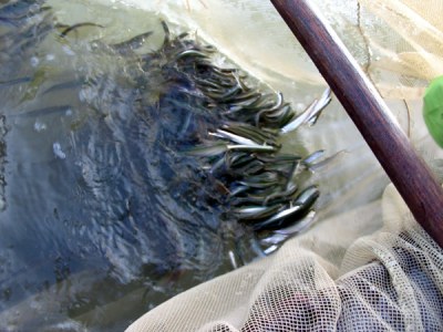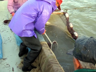 3月下旬から5月下旬にかけて厚岸湖で行われ、操業は毎日上潮時に実施し、通常1日2回行います。1回の操業時間は1~2時間程度で、その間胴網に船を横付けし、魚の入りを確認しながら、約10分間隔で魚を漁獲します。船上に揚げた漁獲物は手で一匹一匹選別し、しらうお小型定置網で漁獲したものと同様に保管・出荷します。
