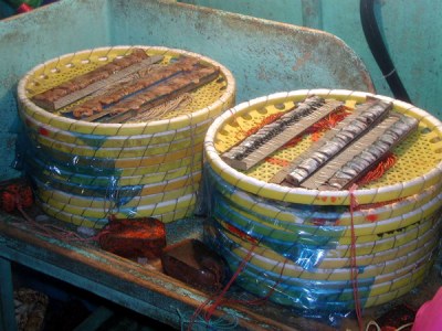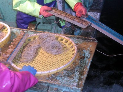 はえ縄1:はえ縄をザルにさやめた状態です。ザル1枚分の縄には針が100本付いています。(江差支所)