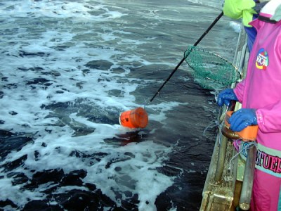 はえ縄投入1:長い仕掛けを絡まないように投入していきます。(江差支所)