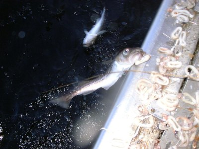 揚縄4:次々とスケトウダラが揚がってきます。船縁に見えるのは餌に使ったイカの輪切りです。