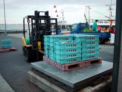計量:陸揚げされた魚箱は、銘柄別に計量します。