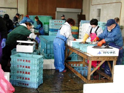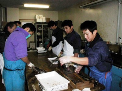 箱詰め1:計量後は、漁業者及び家族が海洋深層水による洗浄を行い、発泡スチロール箱に詰めます。(乙部支所)