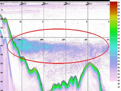 調査1:丸で囲んだ部分が、(道総研)函館水産試験場金星丸の計量魚群探知機による乙部沖スケトウダラの反応です。