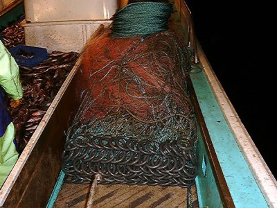 刺し網:投網に備えて整理された刺し網です。網地はナイロン3~4号、目合約85ミリメートルで、縮結(いせ)は浮子方(あばかた)4割、沈子方4.5割程度。