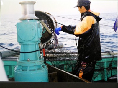 揚網1:設置した網を揚網機(ドラム)で巻きあげます。