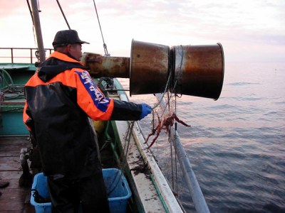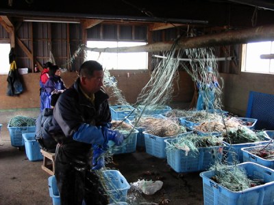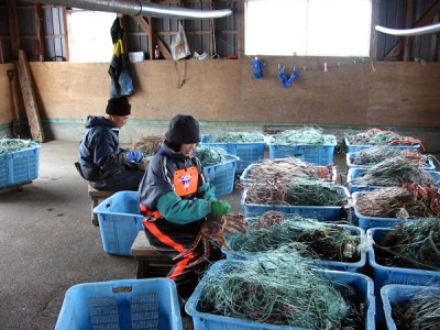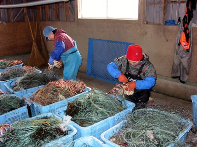 帰港後、各自の作業小屋でタラバガニを網から外し、市場に出荷します。網外し・網さやめは家族の協力がなければできず、家族全員の漁業と言っても過言ではありません。