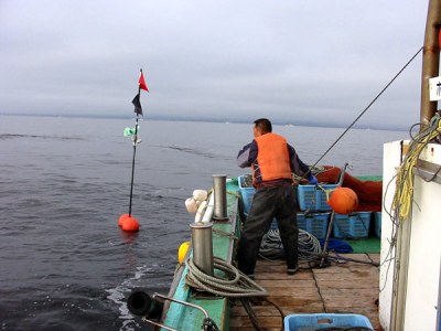 操業は1人または2人乗りで行われており、揚網は不定期、凪をみて夜中の3時頃に出航し、数日前に仕掛けた網を巻き揚げ、続けて新たな網を漁場に設置して8時頃までに帰港します。