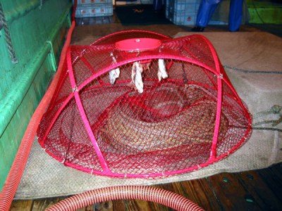 えびかご:餌が付けられ、投入準備完了のかご。 噴火湾海域ではかご目合いは10節(結節から結節までの長さ34ミリメートル)以上。