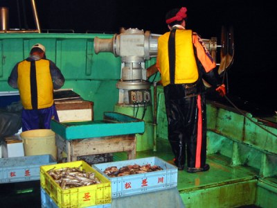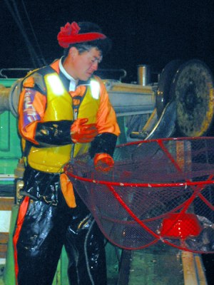 かご揚げ1:午前2時に出港し、漁場に到着後、揚綱機(ラインホーラー)を使ってロープを手繰り、かごを引きあげます。